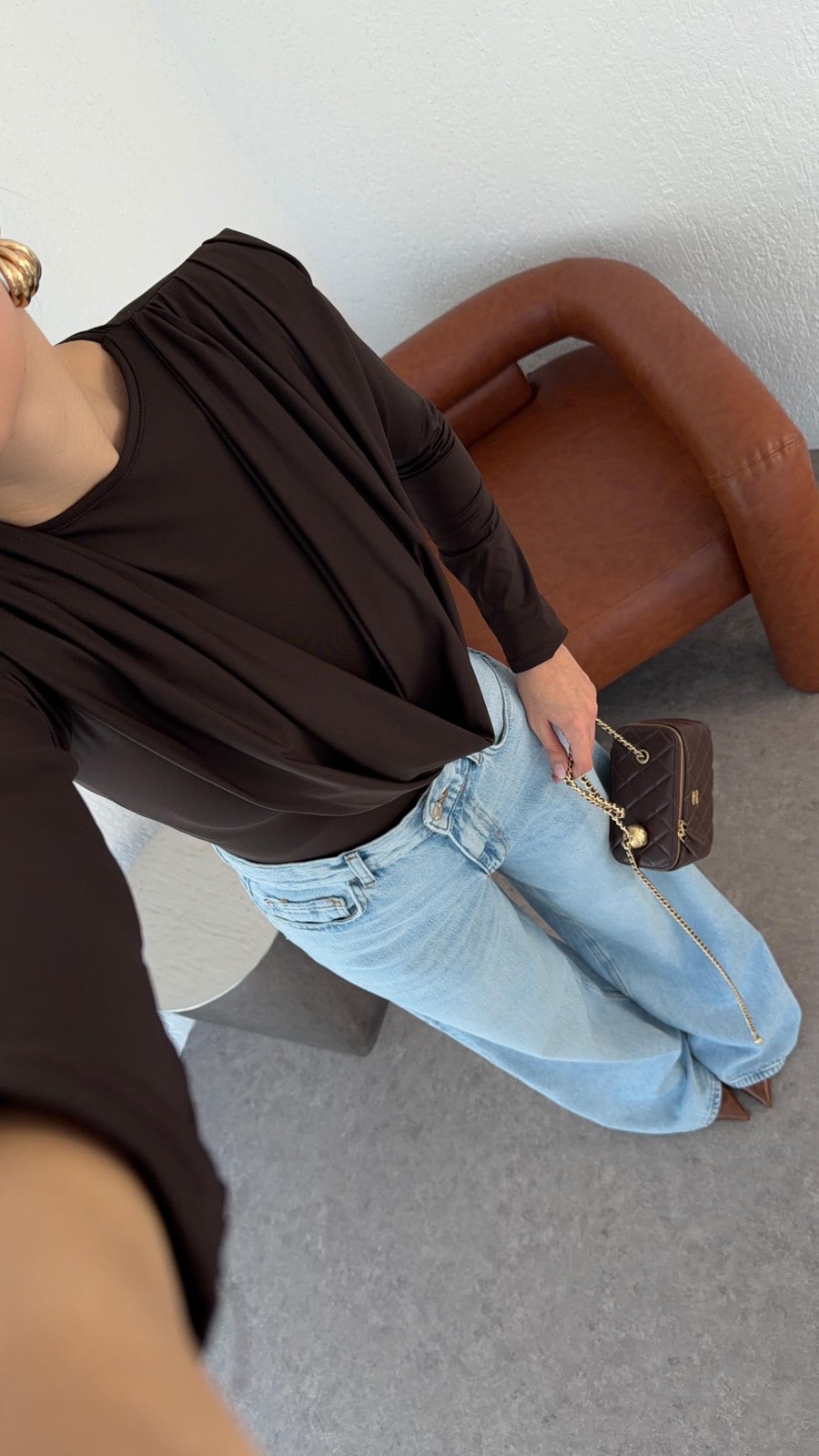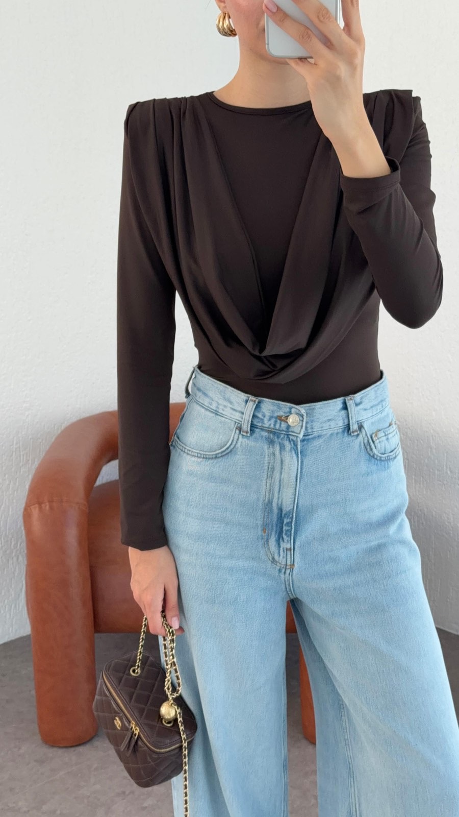Κομψή μπλούζα σε καφέ απόχρωση με μακρύ μανίκι και ιδιαίτερο draped σχέδιο στο μπροστινό μέρος που δημιουργεί ένα θηλυκό, κομψό ντεκολτέ. Η εφαρμογή της αγκαλιάζει όμορφα το σώμα, ενώ το ύφασμα πέφτει απαλά από τους ώμους προς το κέντρο χαρίζοντας ένα elegant και μοντέρνο αποτέλεσμα. Ένα διαχρονικό κομμάτι που μπορεί να φορεθεί από το πρωί μέχρι το βράδυ και να αναβαθμίσει εύκολα κάθε σύνολο.