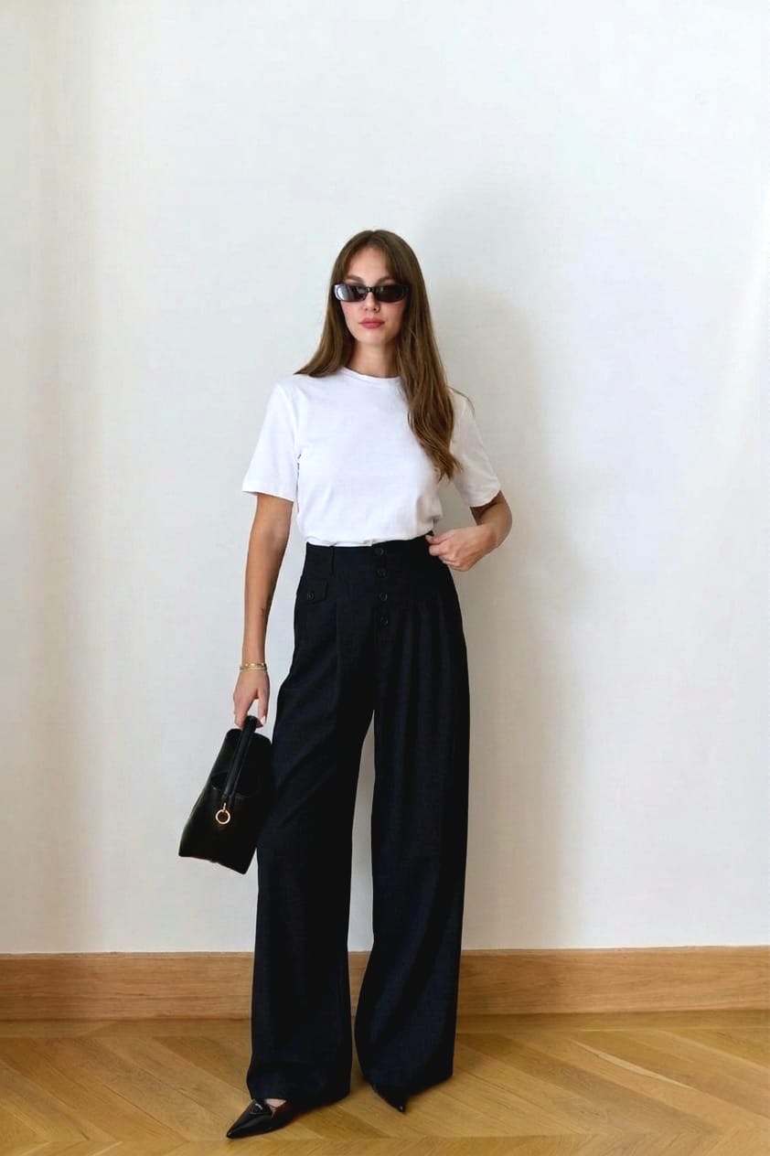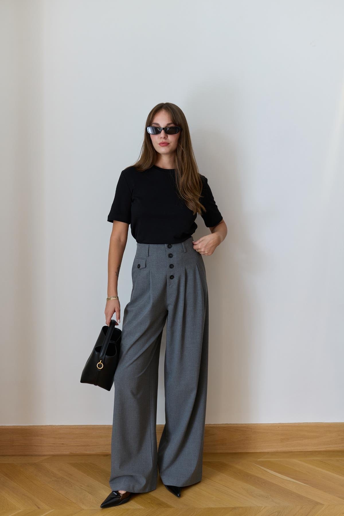 Κομψό ψηλόμεσο παντελόνι σε μαύρη απόχρωση με ιδιαίτερη λεπτομέρεια τα διακοσμητικά κουμπιά στο μπροστινό μέρος που χαρίζουν μια διαχρονική και elegant αισθητική. Η φαρδιά, ίσια γραμμή του πέφτει όμορφα στο σώμα, ενώ η ψηλή μέση τονίζει τη σιλουέτα και επιμηκύνει οπτικά τα πόδια. Ένα κομμάτι που συνδυάζει κλασικό στυλ με σύγχρονη κομψότητα και μπορεί να φορεθεί από το πρωί μέχρι το βράδυ. Μόνο στο Sofi’s Boutique.